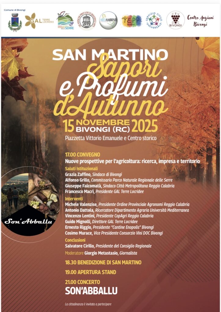 Tutto pronto, a Bivongi, per la giornata conclusiva di “San Martino – Sapori e profumi d’Autunno”, edizione 2025, festa del vino promossa dall’amministrazione comunale in collaborazione con il Gal Terre Locridee, il Parco Nazionale delle Serre e la Pro Loco.