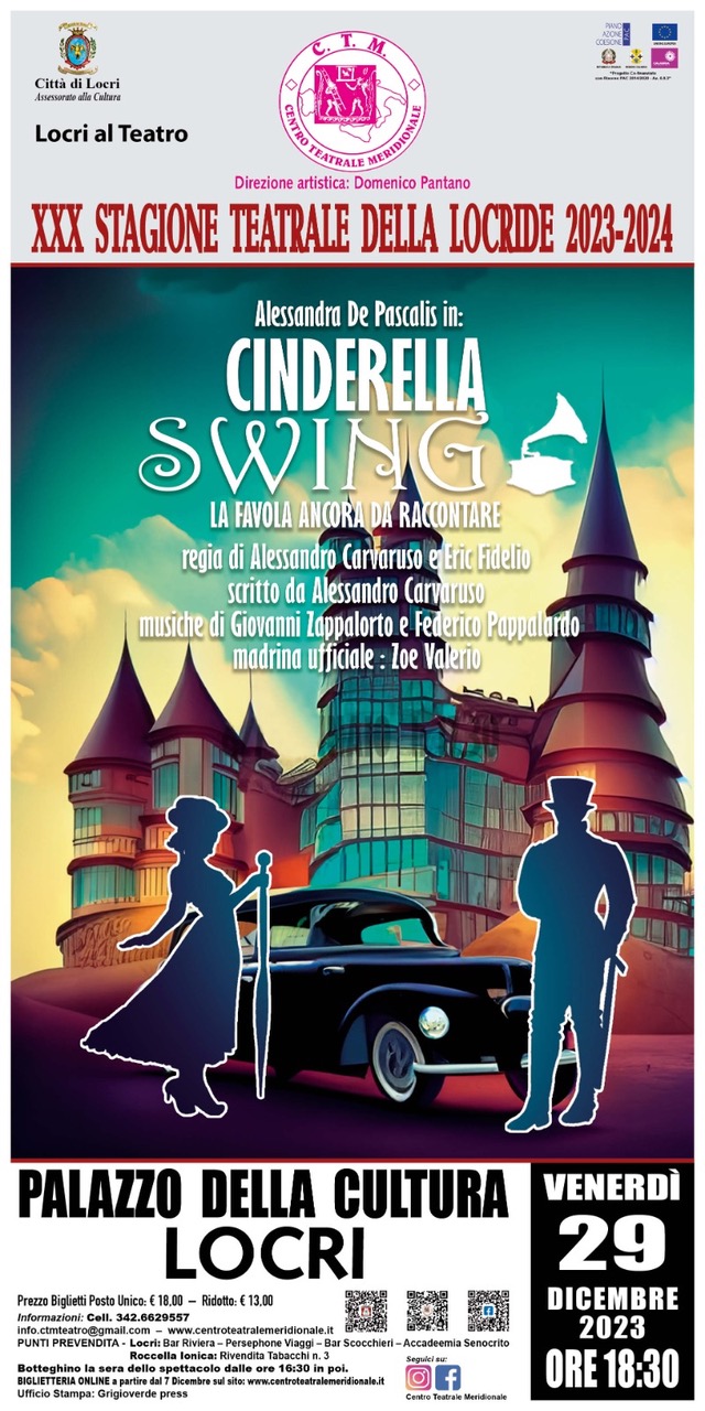 Cinderella Swing La favola ancora da raccontare andrà in scena per il pubblico di Reggio Calabria mercoledì 27 dicembre alle ore 20.30 all’Auditorium Zanotti Bianco, nell’ambito del Progetto Reggio Fest 2023: Cultura diffusa promosso dal Comune di Reggio Calabria (finanziato a valere sul Fondo nazionale per lo spettacolo dal vivo della Direzione Generale Spettacolo del Ministero della Cultura), e venerdì 29 dicembre alle ore 18.30 a Locri presso il Palazzo della Cultura, per la XXX Stagione Teatrale della Locride 2023-2024, nell’ambito della rassegna Locri al Teatro promossa del Comune di Locri e dall’Assessorato alla Cultura del Comune di Locri.