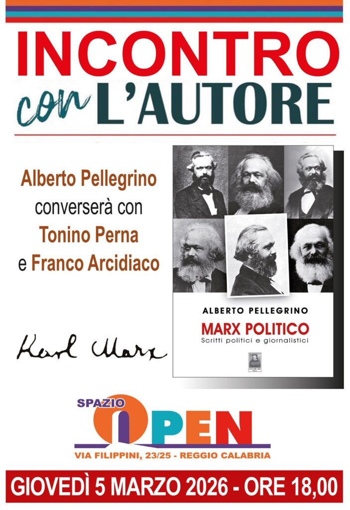 Mentre Reggio Calabria s’appresta a vivere una complicata campagna elettorale per le comunali del prossimo maggio, Spazio Open, in via Filippini, offre, alle ore 18 di giovedì 5 marzo, un’intrigante opportunità: la presentazione del libro di Alberto Pellegrino, “Marx politico. Scritti politici e giornalistici”, che Città del Sole Edizioni ha pubblicato nelle scorse settimane.