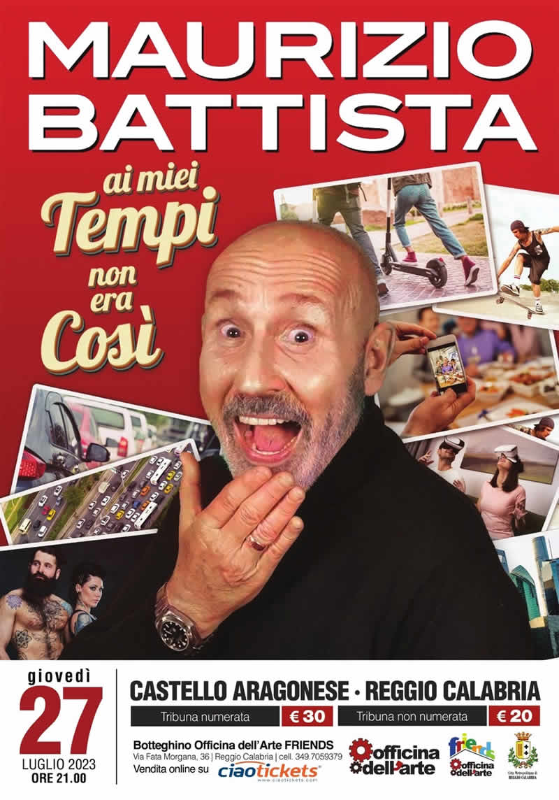 Torna in riva allo Stretto, il comico Maurizio Battista pronto a strappare tante risate ai reggini e non solo. Il suo live show “Ai miei tempi non era così” programmato per il 27 Luglio al Castello Aragonese, evento organizzato dall’associazione culturale Officina dell’arte di Peppe Piromalli in sinergia con la Città Metropolitana di Reggio Calabria, vedrà il noto attore romano dare una risposta alle tante domande sul passato e presente. Il vulcanico Battista, in un precisissimo slalom per non urtare i paletti dell’ipocrisia e dell’ignoranza, issati dall’epoca attuale, è pronto a smascherare inganni e sotterfugi della contemporaneità.