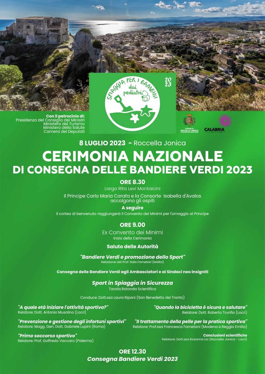 Sarà l’ex Convento dei Minimi di Roccella Jonica, nella Città Metropolitana di Reggio Calabria, ad ospitare quest’anno la cerimonia nazionale di consegna delle “Bandiere Verdi 2023”, il riconoscimento che indica le spiagge adatte alle vacanze di famiglie con bambini, accuratamente scelte dai pediatri dell’International Workshop of Green Flags, presieduto dal Prof. Italo Farnetani, docente universitario di Pediatria e ideatore, nel 2008, della iniziativa.