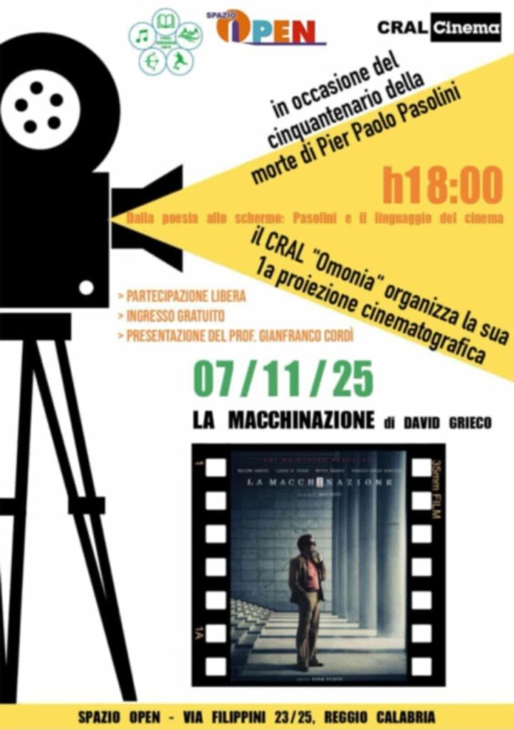 In occasione del cinquantenario della morte di Pier Paolo Pasolini, il CRAL “Omonia” organizza il convegno: “Dalla poesia allo schermo: Pasolini e il linguaggio del cinema”. L’incontro si terrà presso lo “Spazio Open” (Via Filippini, 23/25) dalle ore 18.00 di venerdì 7 novembre 2025. Dopo i saluti di Gianni Vittorio, del CRAL, seguiranno gli interventi del poeta Elio Stellitano, del quale una sua poesia è stata pubblicata da Pasolini quando quest’ultimo dirigeva la rivista “Nuovi Argomenti” e del filosofo Gianfranco Cordì, che affronterà i temi della poesia e del cinema pasoliniani in relazione alla corrente letterario-cinematografica  del Neorealismo. A seguire la discussione si incentrerà intorno ai contenuti del film “La macchinazione “ di David Grieco che ripercorre il momento della tragica scomparsa dell’autore de “le ceneri di Gramsci”. L’iniziativa intende proporsi come scopo due obiettivi: far conoscere anche alla nuove generazioni l’opera del poeta di Casarsa ma anche cercare di analizzare, come diceva il filosofo Benedetto Croce, “ciò che è vivo e ciò che è morto”, oggi, di quella stessa opera. In questo senso, il contributo teorico più rilevante pare proprio quello che Pasolini offrì come editorialista del “Corriere della Sera” perché in esso sono apparse alcune analisi determinanti per comprerndere anche quello che sta succedendo oggi. I temi del capitalismo, della omologazione, della mutazione antropologica, del conformismo, della perdita di autenticità delle persone, della tradizione, della difesa di un mondo contadino e rurale che non c’è più, furono, infatti, quelli espressi negli articoli e negli interventi pubblici di Pasolini lungo il corso della sua attività.