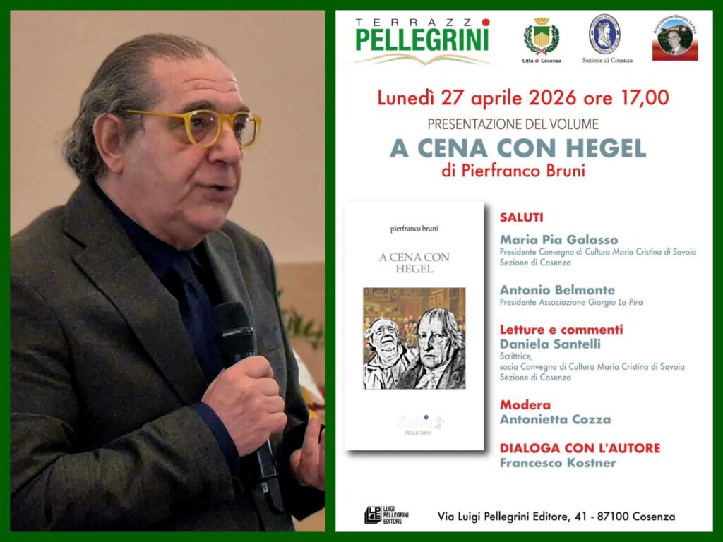 (via Luigi Pellegrini Editore, 41) un importante appuntamento letterario  filosofico dedicato alla presentazione del nuovo libro di Pierfranco Bruni, intitolato “A Cena con Hegel”.