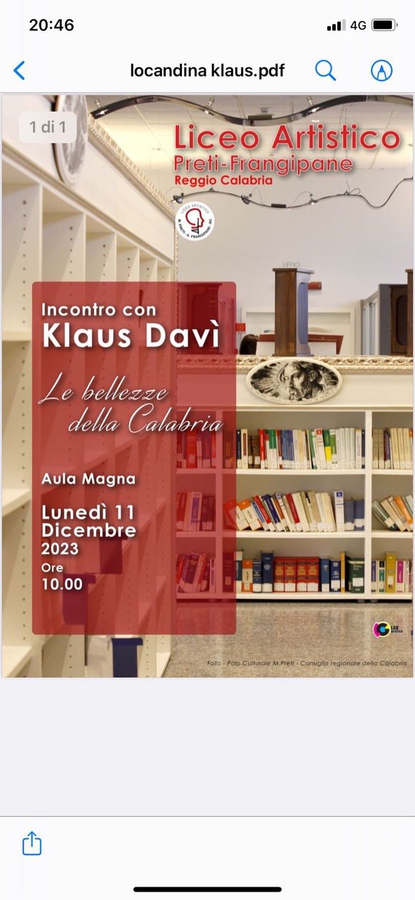 Il secondo invece vedrà un intervento al Liceo artistico Preti – Frangipane di Reggio CalEVabria lunedì 11 dicembre 2023 alle ore 10:00 presso Aula Magna. Davi parlerà delle bellezze della Calabria.