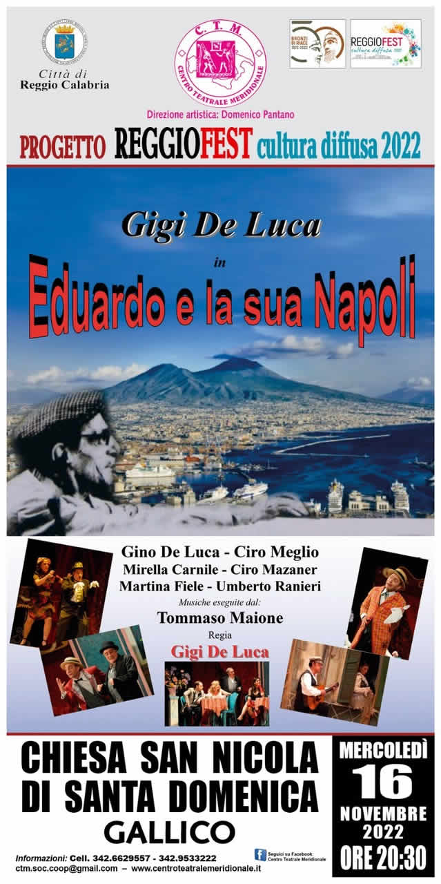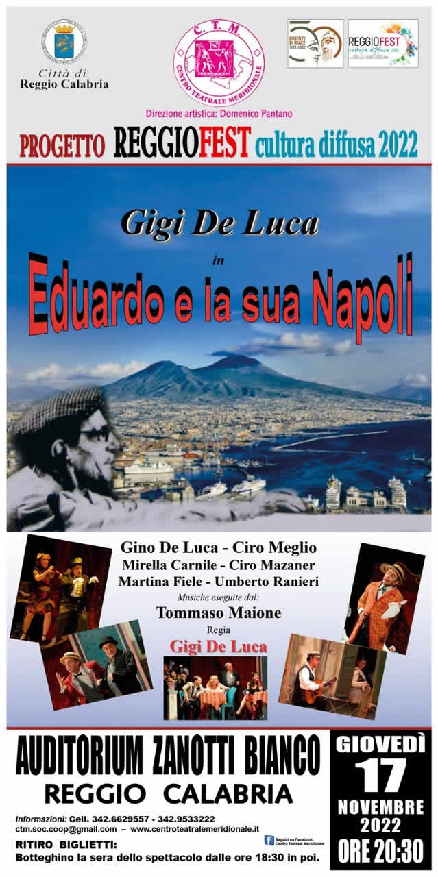 In scena Gigi De Luca in “Eduardo e la sua Napoli”, con Gino De Luca, Ciro Meglio, Mirella Carnile, Ciro Mazaner, Martina Fiele, Umberto Ranieri, musiche eseguite da Tommaso Maione, per la regia dello stesso Gigi De Luca.