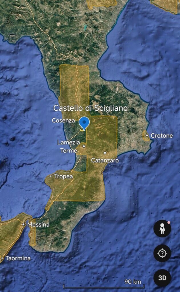 L’immagine proviene dalla celebre mappa “Calabria Citerior”, realizzata tra il 1580 e il 1583 dal cartografo Ignazio Danti. In essa è raffigurato il Castello di Scigliano con torri merlate, mura possenti e archi maestosi, offrendo una rappresentazione chiara e documentata della sua configurazione originaria.