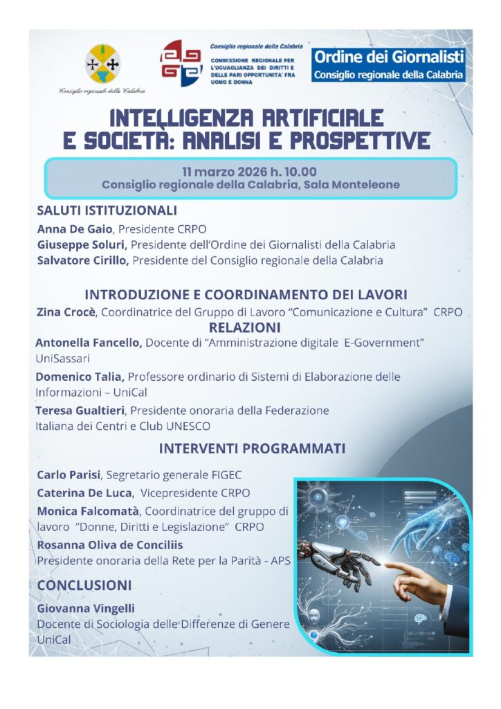 “Intelligenza Artificiale e Società: Analisi e Prospettive” che si terrà martedì 11 marzo 2026, alle ore 10.00 presso il Consiglio Regionale della Calabria – Sala Monteleone.