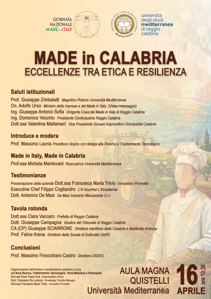 In occasione della Giornata Nazionale del Made in Italy 2026, istituita per celebrare la creatività e l’eccellenza del sistema produttivo nazionale, domani 16 aprile 2026 alle ore 10:30 nella cornice dell’Aula Magna Quistelli, l’Università Mediterranea di Reggio Calabria promuove un’importante iniziativa dal titolo “Made in Calabria: eccellenze tra etica e resilienza” con l’obiettivo di sostenere una cultura d’impresa saldamente ancorata ai valori della legalità, dell’etica e della responsabilità sociale. Attraverso questo momento di confronto, l’Ateneo reggino intende valorizzare alcune realtà imprenditoriali calabresi che operano con trasparenza in contesti complessi, trasformandosi in modelli di resilienza e motori di uno sviluppo economico sano. L’evento rappresenterà un’occasione per consolidare reti di partenariato tra imprese, mondo accademico e associazioni di categoria, orientate alla diffusione di buone prassi etiche. L’organizzazione è curata dall’Area Ricerca, Trasferimento Tecnologico, Terza Missione e partecipate di Ateneo, nell’ambito delle attività strategiche previste dal bando per il potenziamento degli uffici di trasferimento tecnologico (UTT).