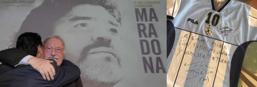 “… La prima volta avevo spiegato al suo addetto stampa, che volevo parlare con lui non di tattiche ma della vita, di quello in cui credeva, senza pettegolezzi, e Maradona aveva apprezzato il mio tentativo di capire, con discrezione ma senza reticenze. Avevo scoperto che era molto più intelligente di come veniva dipinto. Un uomo complesso e contraddittorio, ma mai un ipocrita… Era molto generoso, un uomo di parola. Ricordo che prima di Italia-Argentina, nella semifinale del Mondiale ’90 che poi gli azzurri perdettero, mi promise che qualunque fosse stato il risultato sarebbe venuto alla trasmissione che conducevo a mezzanotte in Rai. Bene: ancora in maglietta e calzettoni, dribblò gli altri giornalisti, dicendo: ‘Scusate, ma io ho un appuntamento con Minà“. Volevano interrompere l’intervista per dare spazio agli altri, ma lui si rifiutò e urlò: ‘Fate pure il teatrino che volete, ma io rimango qui con Gianni“.