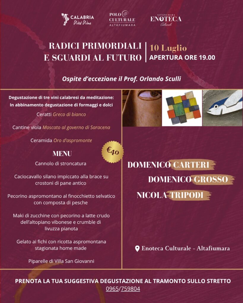 Al termine dell’inaugurazione, i visitatori saranno accolti in un’esperienza sensoriale che completa il viaggio artistico: una degustazione di vini passiti calabresi, accompagnati da formaggi e dolci tipici, a cura dello Chef Executive Antonio Battaglia, con la partecipazione straordinaria del Prof. Orlando Sculli.