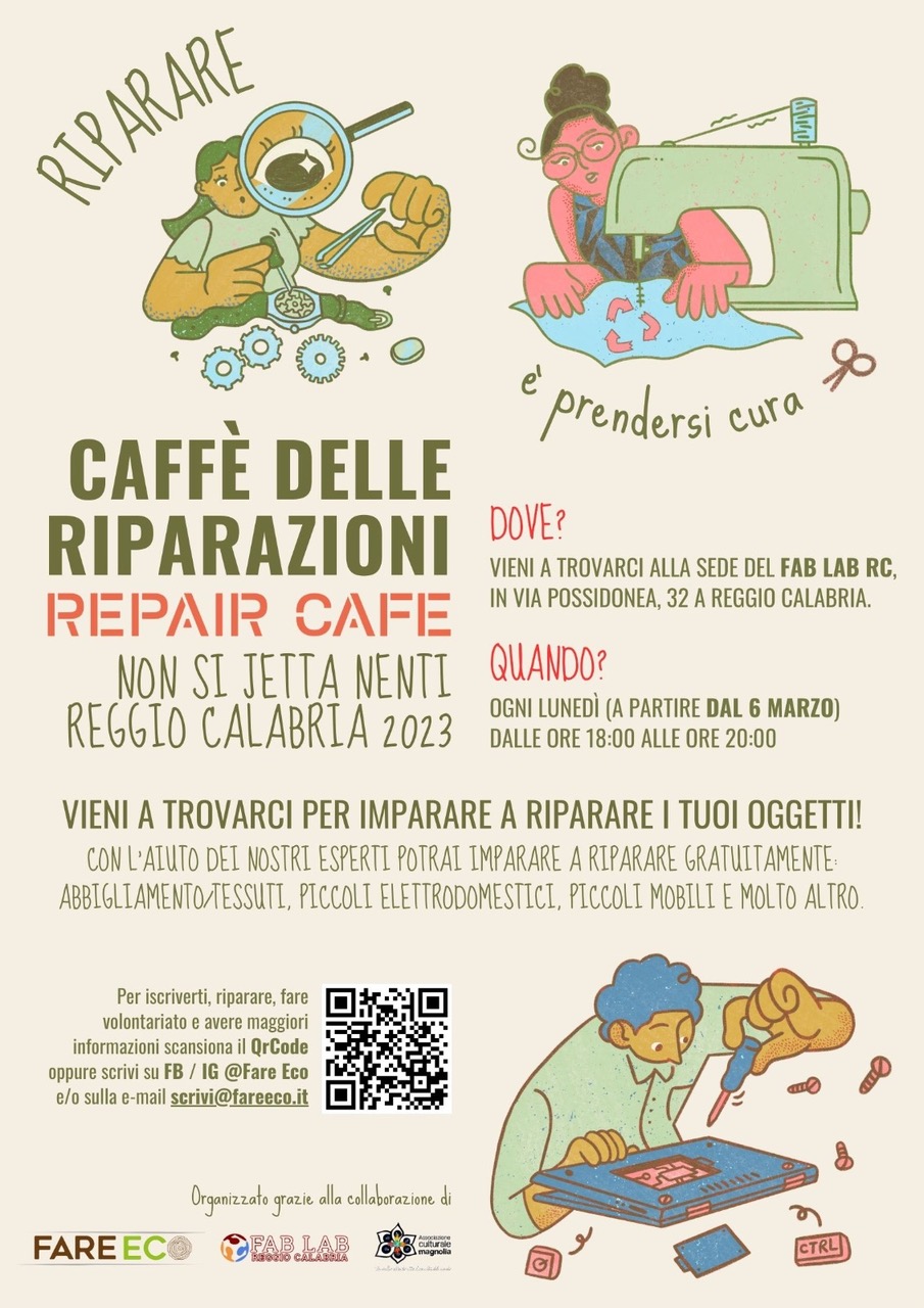 Per promuovere in città la buona pratica della riparazione, l’associazione Fare Eco ha voluto riprendere nel 2022, grazie ad un bando dello Europe Direct del Comune di Reggio Calabria, l’attività dei caffè delle riparAzioni, avviati dal 2019 a Reggio Calabria dall’associazione culturale Magnolia.