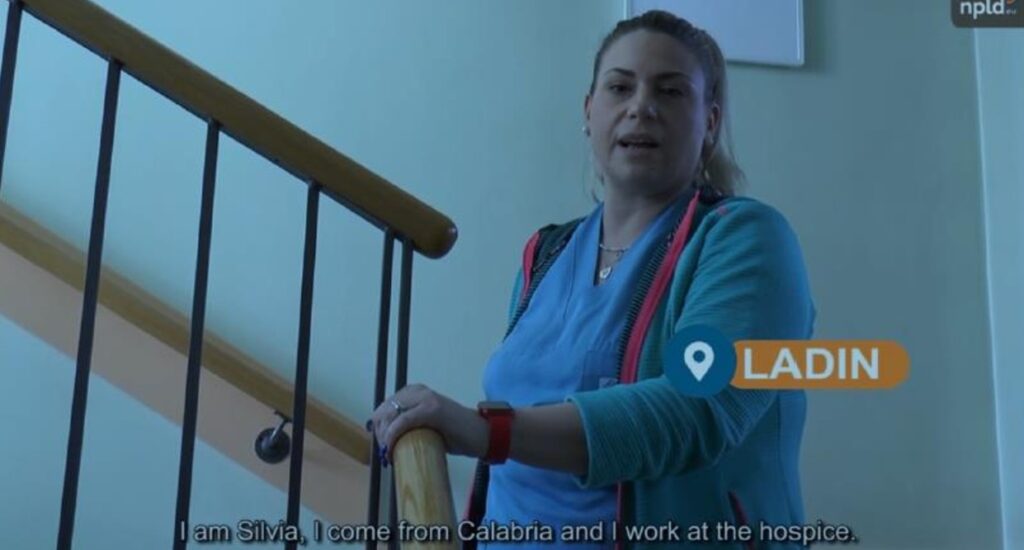 Perché il coinvolgimento dei servizi sociali? Abbiamo preso come riferimento la foto n. 1 tratta da un importante audiovisivo dedicato all’utilizzo della Lingua Madre nell’ambito socio -sanitario nel mondo audiovisivo realizzato dall’Istituto di Cultura per la Lingua Ladina della Val di Fassa (TN) in cui si vede una signora calabrese che lavora in un Hospice della Provincia di Trento e i lavoratori sanitari hanno frequentato corsi di lingua ladina per far sentire a casa propria i degenti di quella struttura.