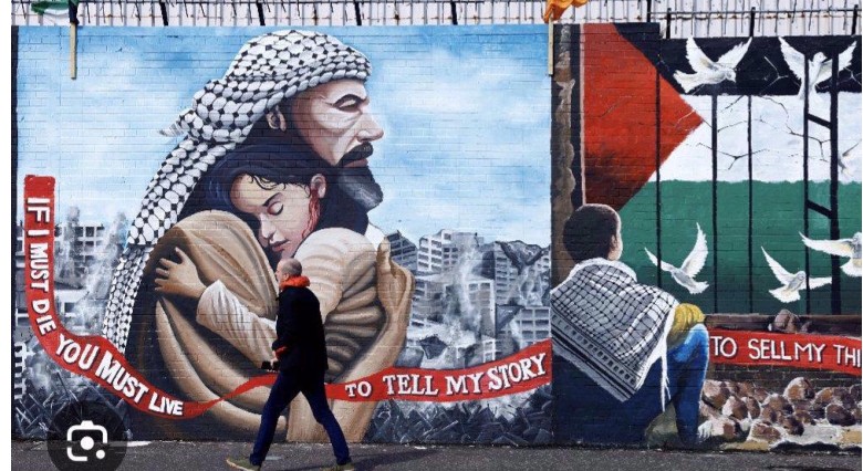 Un murale di Khaled Nabhan e Reem sul Belfast Solidarity Wall a Belfast, Irlanda del Nord.