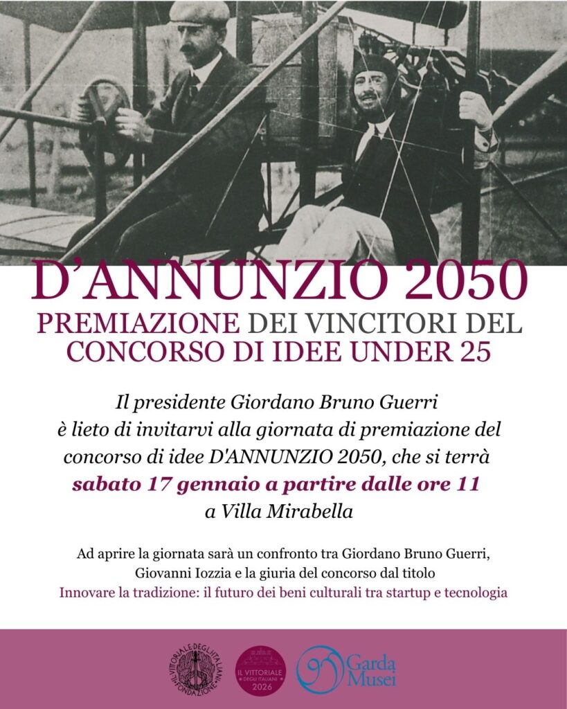 Lì, alle ore 11 del diciassette di gennaio, sabato, accadrà la presentazione dei progetti finalisti e la proclamazione dei vincitori del Concorso di idee “D’Annunzio 2050 – Cultura, innovazione e imprenditorialità per il Vittoriale 2.0”, promosso dalla Fondazione Vittoriale degli Italiani.