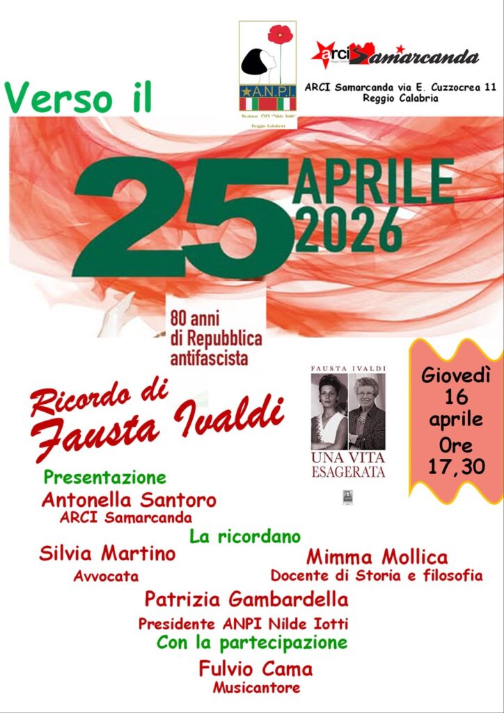 Anche quest’anno la sezione ANPI “Nilde Iotti” di Reggio Calabria, insieme al Circolo Samarcanda, promuove il percorso di iniziative culturali e commemorative “Verso la Festa del 25 Aprile”, un ciclo di appuntamenti pensato per accompagnare la cittadinanza verso la celebrazione della Liberazione.